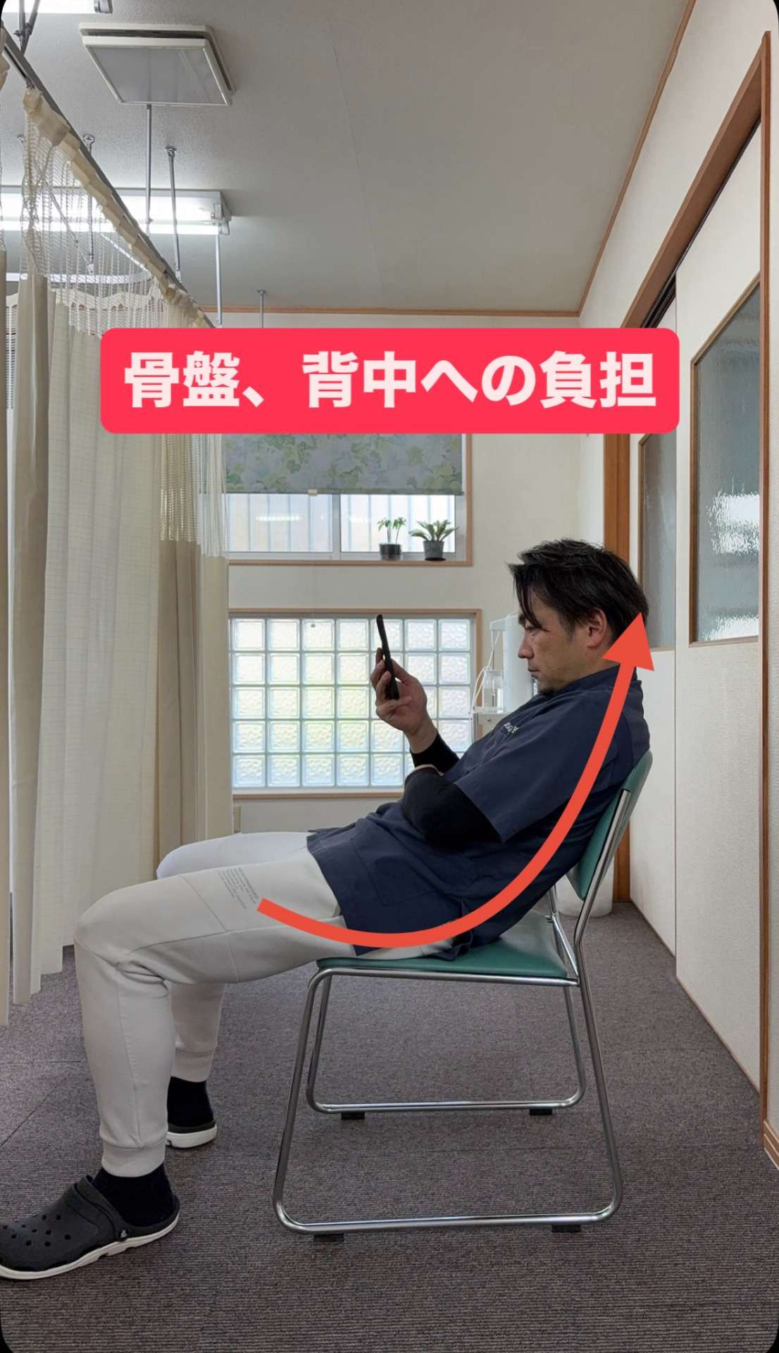 この写真の場合ですと、骨盤の仙骨という骨に重心がかかり背中は丸くなり、お腹の腸腰筋は引き伸ばされ負担がかかっています。座っている本人は力を入れないで座っているため楽には感じますが、身体は悲鳴をあげている状態です。スマホを見続けこの状態が長ければ長いほど負担になります。毎日ストレッチをして、筋トレをして、ジョギングをして、身体に良いものを食べていてもこの姿勢が長時間続くとプラマイゼロです。非常にもったいないですよね(>_<)
